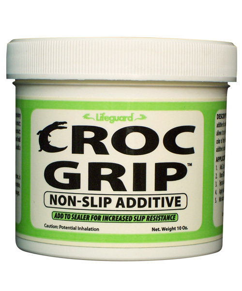 Lifeguard’s Croc Grip™ is a polymeric powder designed for high gloss solvent sealers to impart slip resistance. Croc Grip’s low density and insolubility properties will minimize settling without altering the viscosity of the sealer. Croc Grip helps increase the friction of treated surfaces and is ideal for areas where water accumulates. Great for pool decks, driveways, walkways and patios.